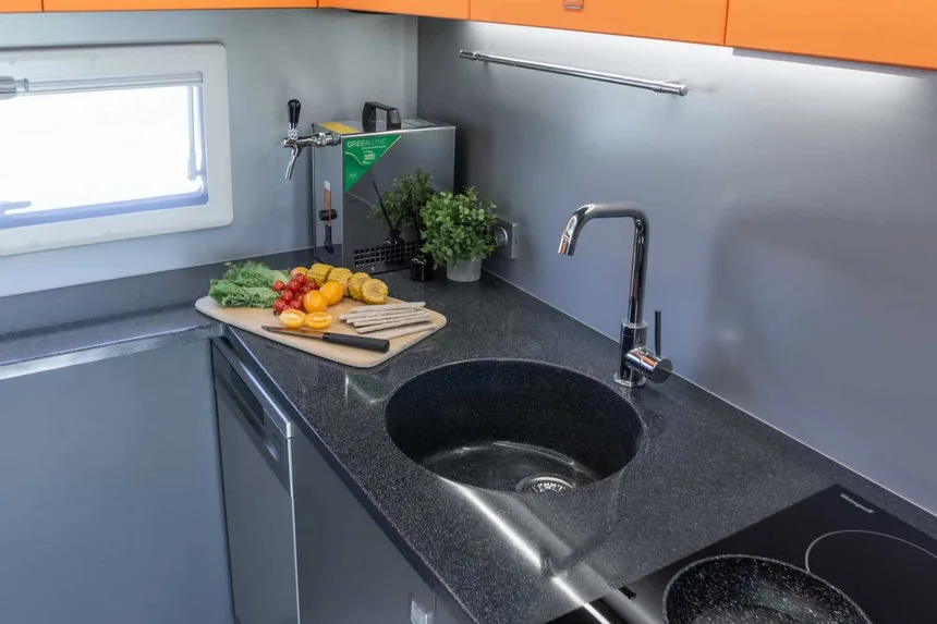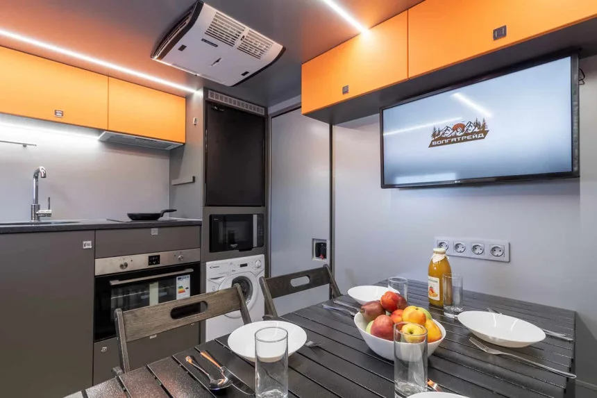 Центральную часть занимает гостиная с кухонной зоной. Она оснащена электрической варочной поверхностью, духовкой, микроволновой печью, компрессорным холодильником, посудомоечной и стиральной машинами, кофеваркой и системой нагрева и охлаждения воды.