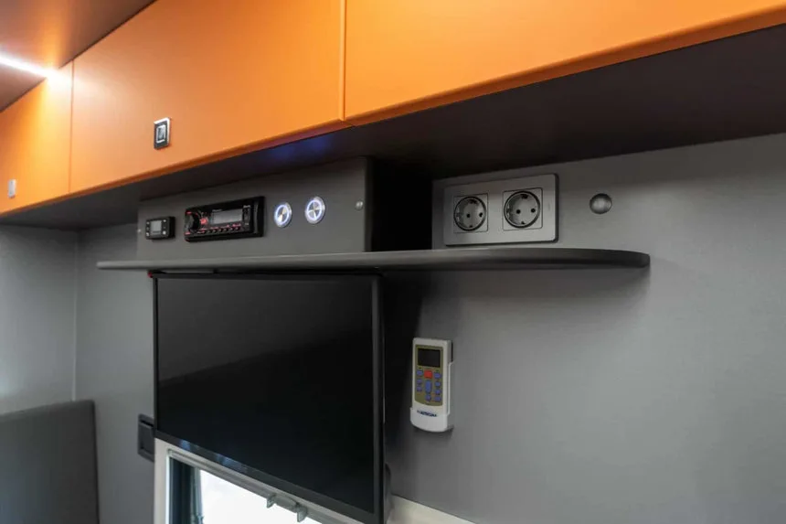 В салоне установлены отопитель Eberspacher и крышный кондиционер Autoclima с принудительной вентиляцией. Электроснабжение обеспечивается дизельным генератором и аккумуляторным блоком. В автодоме предусмотрен душ с баком на 400 литров воды и четыре 32-дюймовых телевизора с поддержкой Smart TV.