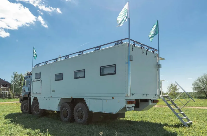 Машина построена на доработанном грузовике с усиленной конструкцией. Шасси оборудовано экспедиционным багажником на крыше, дополнительной светодиодной оптикой и защитой топливных баков. Общая длина жилого фургона составляет около 9 метров.