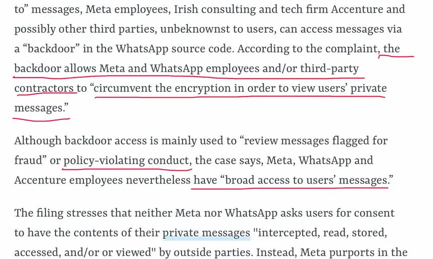 «»Шифрование» WhatsApp может быть крупнейшим в истории случаем обмана потребителей… Несмотря на свои заявления, приложение читает сообщения пользователей и передает их третьим лицам», — написал он.