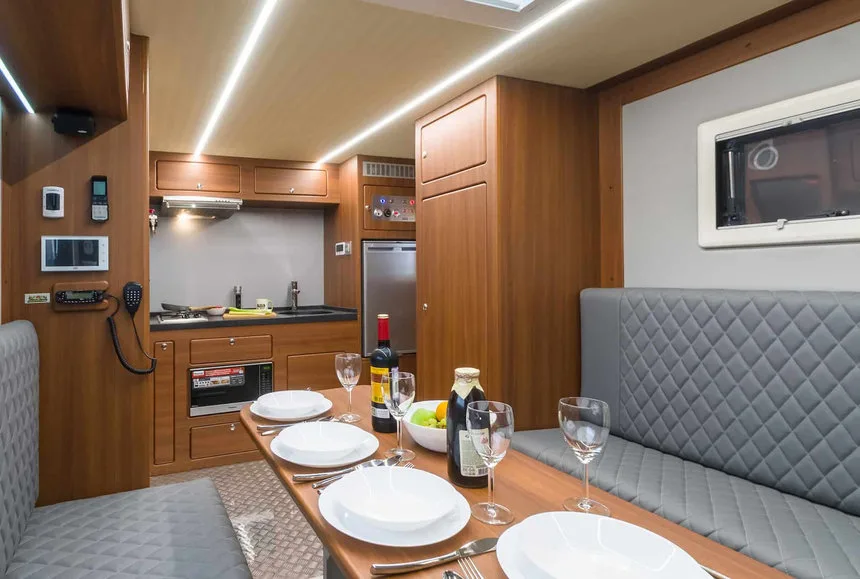 Внутренняя планировка разделена на гостиную с кухонным гарнитуром и изолированную спальную зону с полноценной двуспальной кроватью. Кухня укомплектована холодильником, микроволновой печью, вытяжкой и раковиной. Комфортную температуру в жилых отсеках поддерживает современная система кондиционирования.