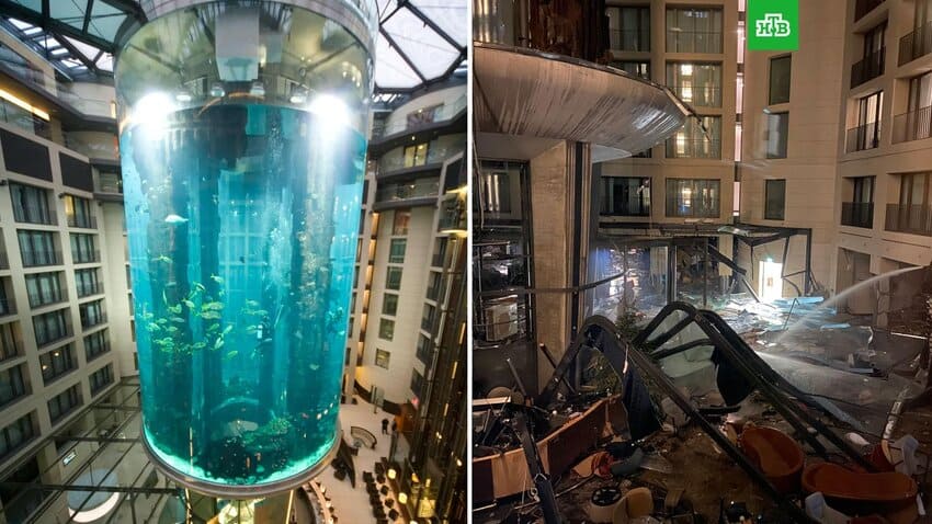 По сообщению издания, берлинский Aquadom – самый большой аквариум цилиндрической формы в мире. Его открыли в 2003 году, инвестиции составили почти 13 млн евро. Вес 16-метровой конструкции – около 2 тонн. Сейчас аквариум разрушен – он внезапно треснул. Примерно миллион литров воды из него вылились внутри отеля, где и находился аквариум. Затем потоки воды устремились на улицы города. А вместе с ними и 97 видов рыб, в числе которых редкие. Все особи задохнулись и спасти их было невозможно.