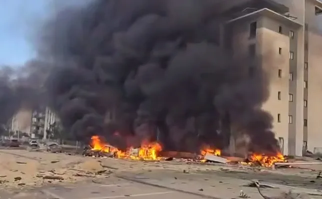 По информации тг-канала Baza, снаряд взорвался на парковке, вызвав пожар и серьёзные разрушения здания.