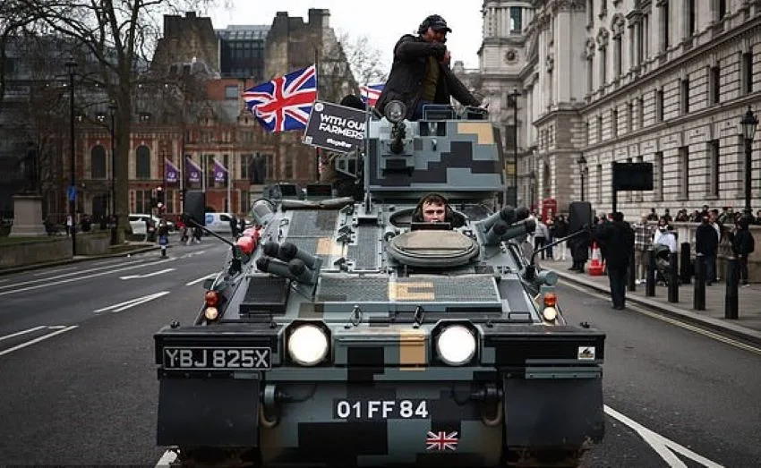 Статья проиллюстрирована фотографией, где запечатлен движущийся по лондонской улице танк, украшенный британскими флагами. На танке сидят протестующие, у одного из которых в руках плакат с надписью «С нашими фермерами».
