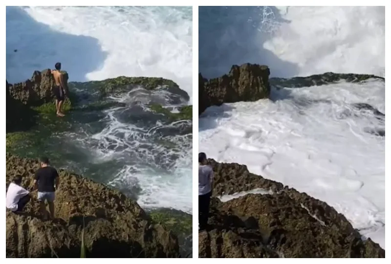 На популярном пляже Кедунг Тумпанг в Индонезии 21-летний турист Рони Джосуа Симанджунтак был унесен в океан мощной волной, когда позировал на прибрежных камнях для фотографии.