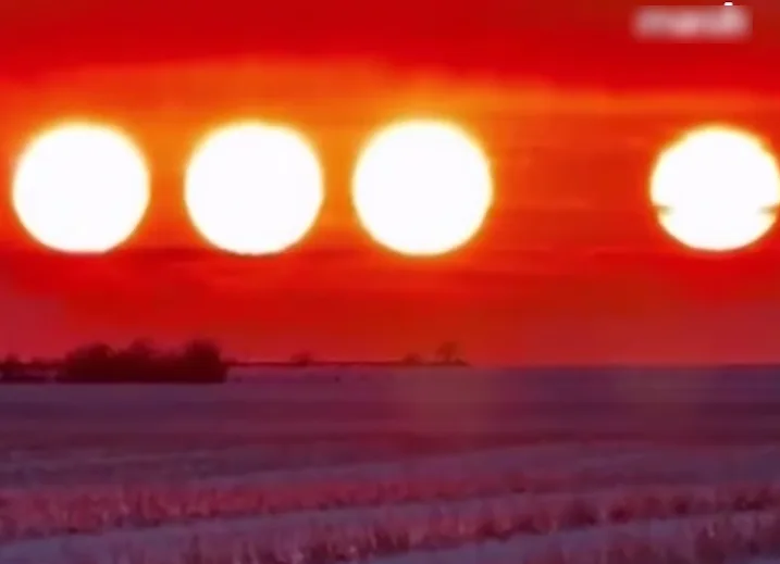 На опубликованных кадрах видно одно настоящее Солнце и три ярких световых пятна рядом с ним. Три ложных светила выстроились почти в одну линию, еще одно располагалось правее, на небольшом расстоянии. Иллюзия создает эффект множественного восхода.