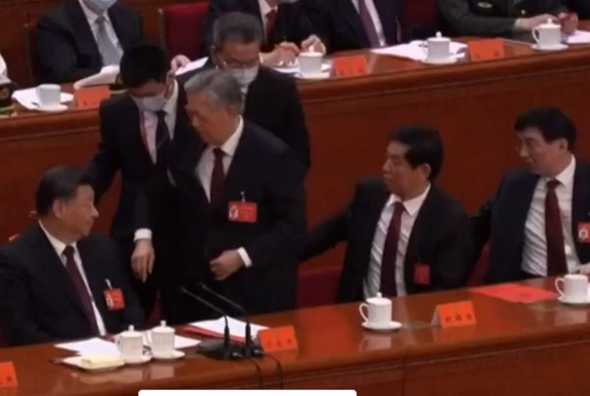 На опубликованных кадрах видно, что бывшего китайского руководителя представители службы протокола выводят из зала против его воли.