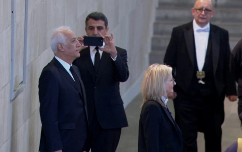 Президент Хачатурян пришёл попрощаться с венценосной особой и, когда подошёл к гробу, попросил своего помощника сделать фото на телефон, чем возмутил британскую общественность. Оказалось, что это первый такой случай нарушения протокола по ходу прощания с Елизаветой II.