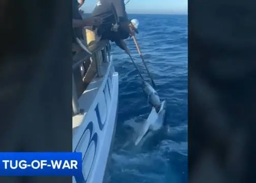 Акула внезапно появилась возле судна и вцепилась в тунца, пытаясь забрать его себе. Некоторое время люди и хищник боролись за рыбу, фактически перетягивая ее между собой.