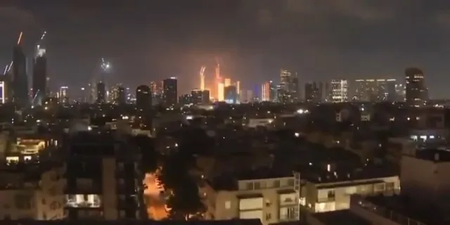 На видеозаписи запечатлено, как иранская ракета стремительно летит в небе над Тель-Авивом. Она мощно врезается в высотные здания, раздается огромный взрыв.