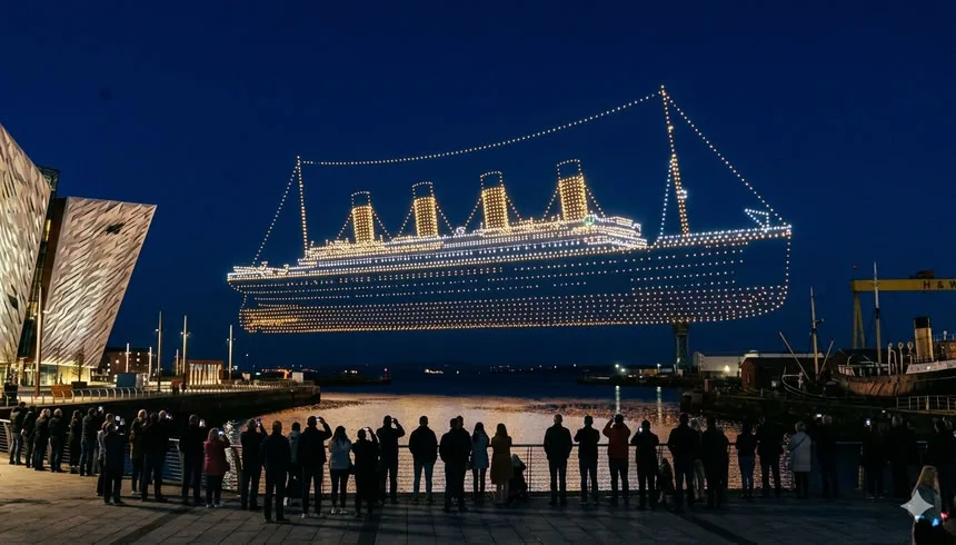 В столице Северной Ирландии, городе Белфаст, состоялось уникальное масштабное световое шоу. При помощи дронов в ночном небе воссоздали изображение легендарного лайнера «Титаник» в натуральную величину. Для создания гигантской инсталляции было задействовано почти 1000 беспилотных летательных аппаратов, сообщает «Би-би-си».