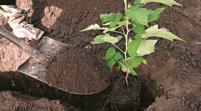 - Саженец устанавливают вертикально в ямку, расправляют корешки, засыпают и трамбуют грунт, а затем тщательно поливают.