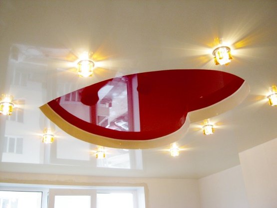 Потолок, выполненный на основе глянцевой плёнки, создаёт необычный дизайн благодаря его способности отражать свет – поверхность получается яркой и визуально создаётся иллюзия «высоты». Яркие примеры такого решения можно увидеть в торгово-развлекательных центрах.