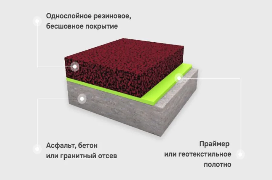 - Устройство резинового покрытия – заливка бесшовной смеси из резиновой крошки и полиуретанового связующего с созданием финишного уклона (1–2%) в сторону дренажных элементов.