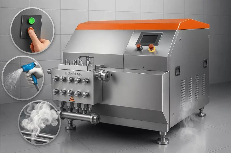 Гомогенизатор располагают до этапа пастеризации или UHT-обработки. Это позволяет термообработке работать эффективнее, так как частицы распределены равномерно и теплоперенос по объёму становится более предсказуемым.
