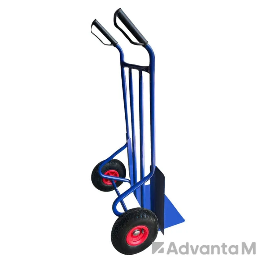Конструкция тележки выполнена из прочного металлического каркаса. Пневматические колеса диаметром 250 мм позволяют легко перемещать груз даже по неровным поверхностям, что делает работу более эффективной и менее утомительной.