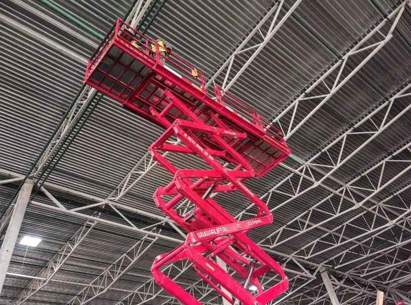 - Ножничные подъемники поднимают платформу без стрелы — через систему рычагов, строго вертикально. Горизонтального вылета нет, но у многих моделей платформа выдвигается до 0,9 метра. Рабочая высота — от 7,8 до 18,2 метра. Это помогает дотянуться до точки, не перемещая всю машину.