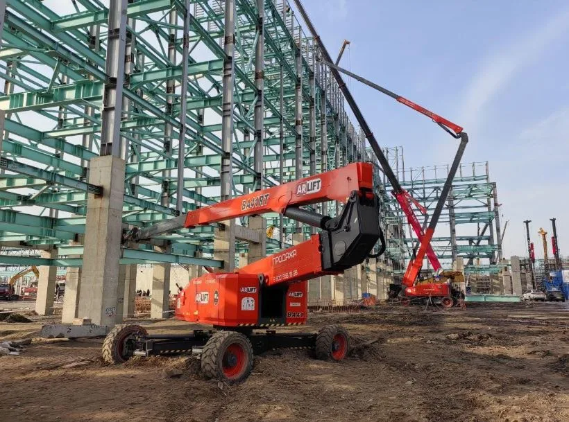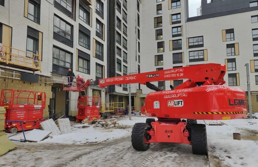 - Коленчатые подъемники — стрела состоит из нескольких секций, соединенных шарнирами. Секции складываются и разгибаются независимо, огибая препятствия: балконы, козырьки, провода, элементы конструкций. Горизонтальный вылет — от 6,78 до 25,5 метра, вертикальный (рабочая высота) — от 12,75 до 48,6 метра. Работают там, где нужно обойти преграду и подобраться к точке монтажа под нужным углом.