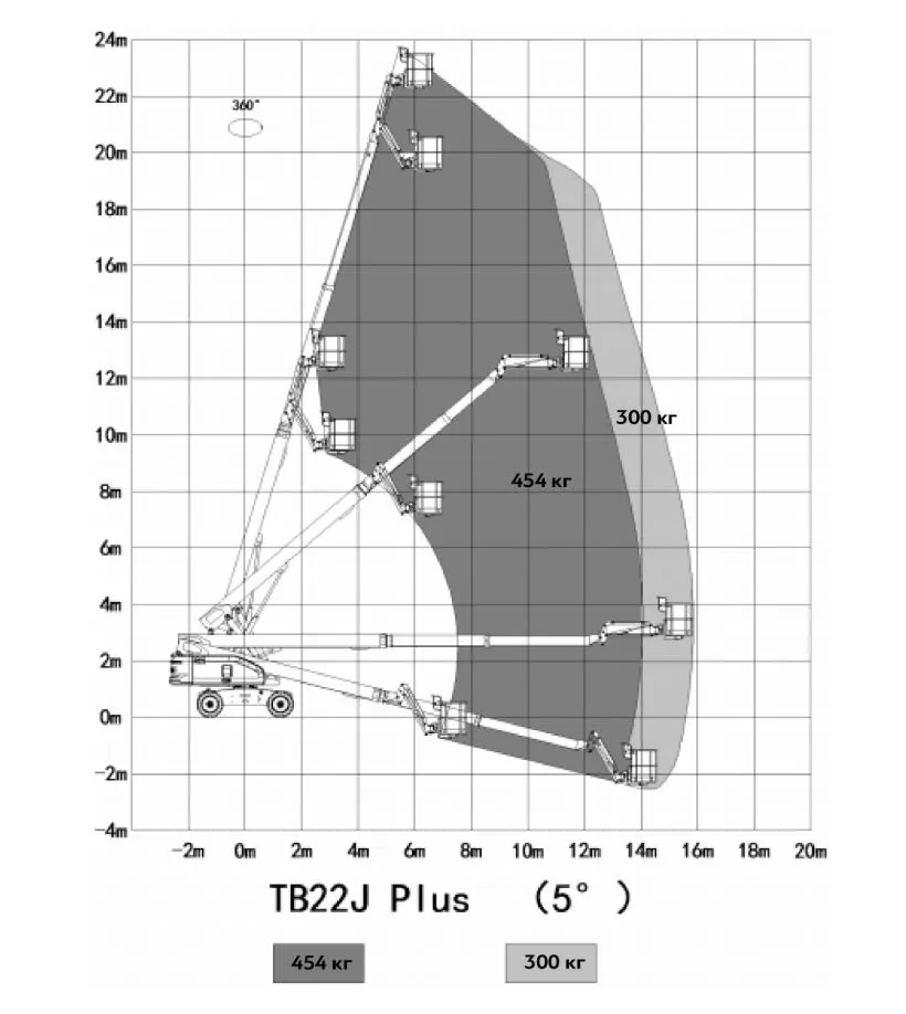 Например, телескопический подъемник TB22J PLUS при минимальном горизонтальном вылете поднимает 454 кг, при максимальном — 300 кг.