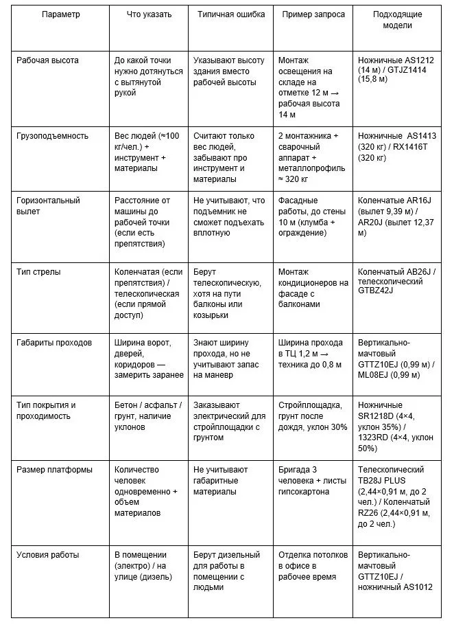Чаще всего путают фактически нужную высоту с рабочей высотой подъемника или не учитывают вес людей, инструментов и материалов при расчете грузоподъемности. Замеряют ширину ворот, но забывают просчитать, пройдет ли техника в проемы по габаритам. Ошибка в параметрах техники обходится дорого.