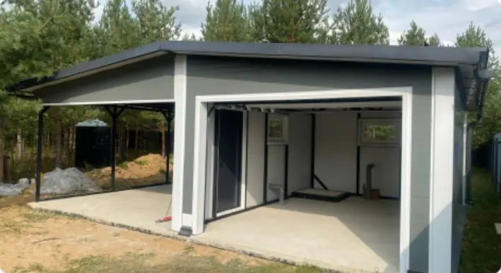 Сэндвич-панели — это прочный и надёжный материал, который обеспечивает долговечность строения. Благодаря металлическому каркасу и многослойной структуре панелей, гаражи с навесом выдерживают различные климатические условия, включая снег, дождь и сильный ветер. Покрытие панелей защищает стены от коррозии, а утеплитель внутри обеспечивает комфортную температуру внутри гаража.