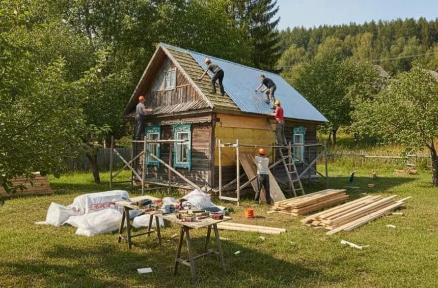 Начали с крыши. Сняли старый шифер, под ним оказалось, что часть стропил просто труха. Сделали новую обрешётку из сухой доски 50×150, обработали антисептиком и закрыли всё металлопрофилем цвета «графит». Кстати, стоило чуть дороже, чем мы планировали, но зато теперь не гремит при дожде и не протекает.