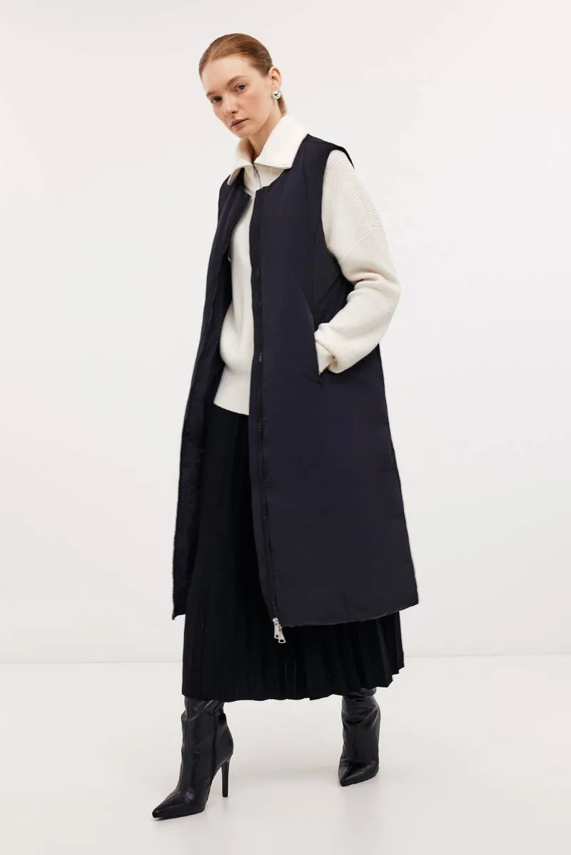 - Жилет имеет прямой крой и застёжку на двухзамковую молнию. Боковые карманы с молниями спрятаны в швы.