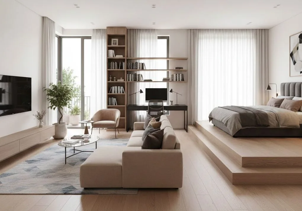 Эффективное зонирование строится на сценариях освещения и группировке мебели, а не на перегородках. Рабочая зона (стол и кресло) должна располагаться у окна или источника естественного света. Лаунж-зона смещается в глубину комнаты, создавая атмосферу камерности. Визуальным разделителем может служить ковер или стеллаж сквозного типа.