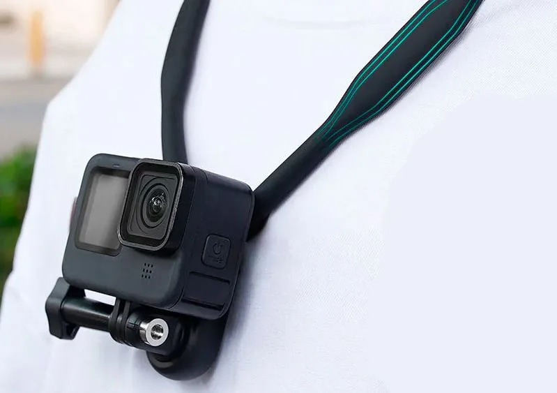 - Система креплений. Комплектуется или совместима с множеством аксессуаров: селфи-палками, нагрудными и головными ремнями, креплениями на шлем, руль, доску для сёрфинга, стекло автомобиля и т.д.