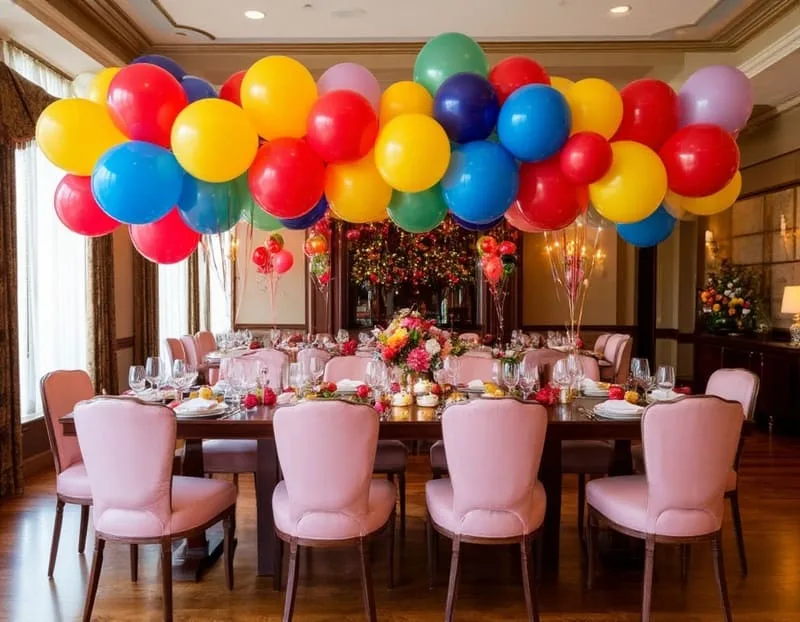 - Оформление столов мини-шарами. Украсьте каждый стол маленькими шарами, размещенными в вазах или на подставках. Также можно сделать тематические композиции, соответствующие стилю праздника.