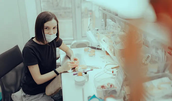 - Облицовка (при необходимости) – если коронка требует керамического покрытия, техник вручную наносит слои керамики и обжигает в печи.