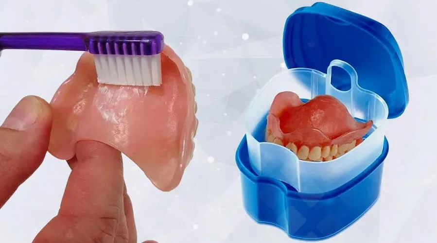 Чистка съёмных протезов должна проводиться дважды в день — после еды и перед сном. Для этого используется мягкая зубная щётка с синтетической щетиной. Жёсткие щётки могут повредить поверхность базиса и вызвать микротравмы десны. Зубная паста должна быть без абразивных частиц — рекомендуется использовать средства, специально предназначенные для протезов, или обычную пасту с минимальным содержанием отбеливающих компонентов.