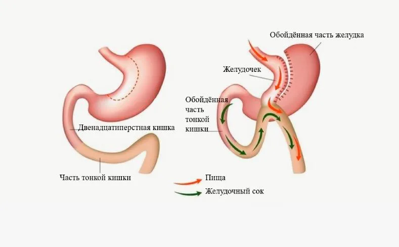 - Мальабсорбтивный компонент — часть тонкой кишки исключается из классического пути усвоения, уменьшая всасывание калорий.