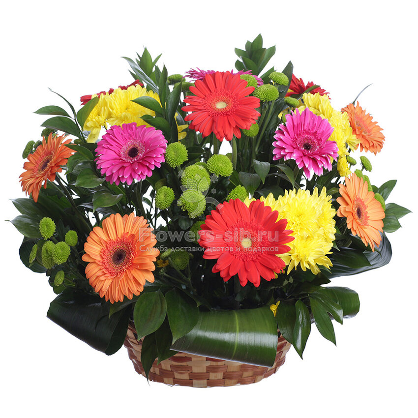 Композиция составлена в пирамидальной форме, выглядит очень необычно и привлекательно. В букете преобладают спокойные оттенки. Такая корзина подойдёт в качестве подарка коллеге или деловому партнёру. Герберы и розы, входящие в состав композиции, прекрасно сочетаются и дополняют друг друга. Яркие герберы символизируют радость и счастье, их цветные нотки словно призывают испытывать эти чувства при каждом взгляде.